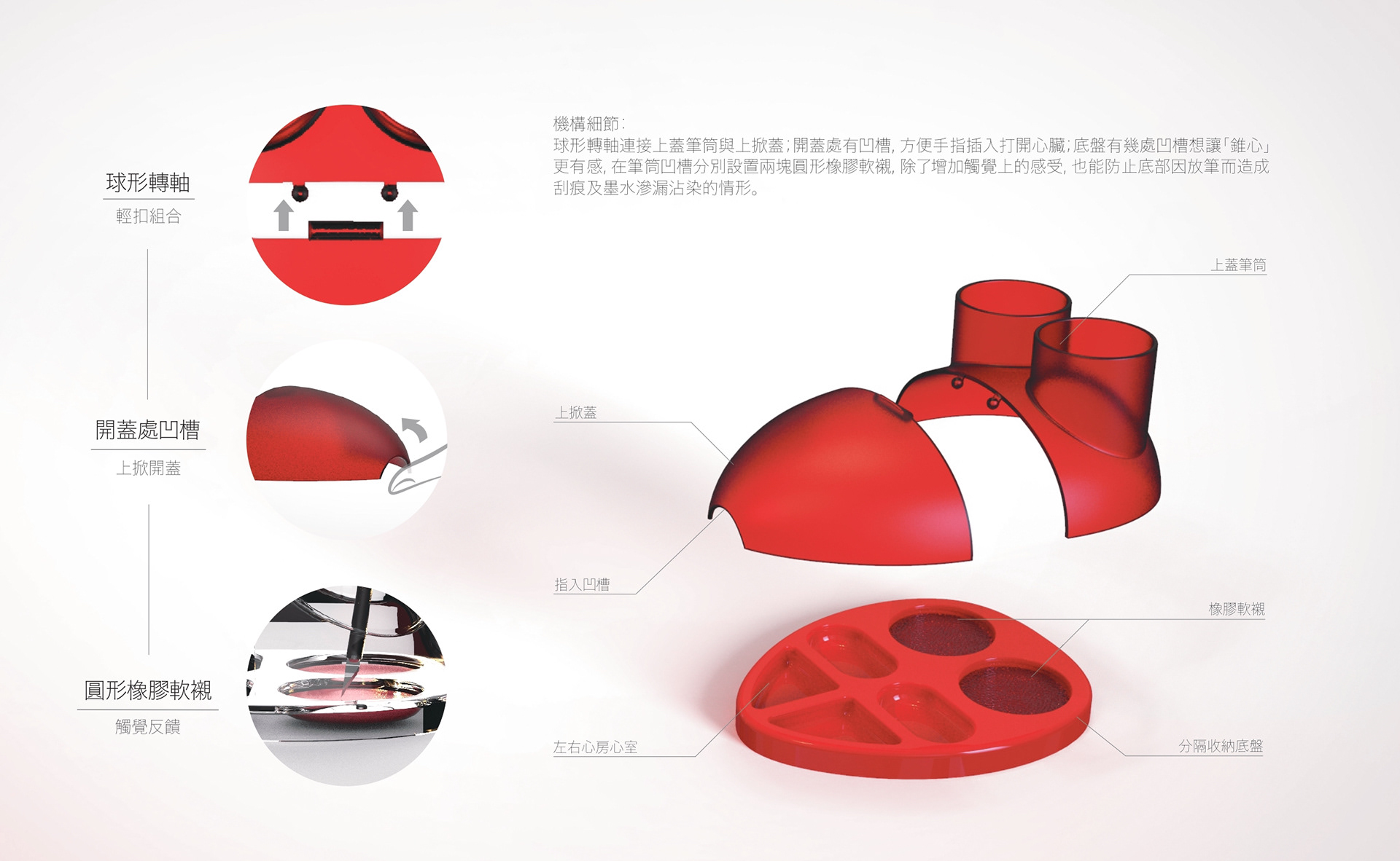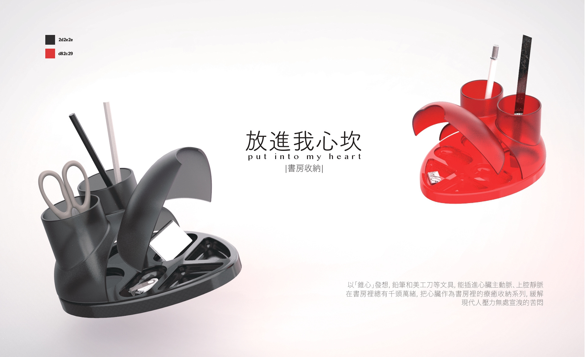 以「錐心」發想,讓鉛筆、美工刀等文具,能插進心臟主動脈、上腔靜脈,在書房裡總有千頭萬緒,把心臟作為書房裡的療癒收納系列,緩解現代人壓力無處宣洩的苦悶。
