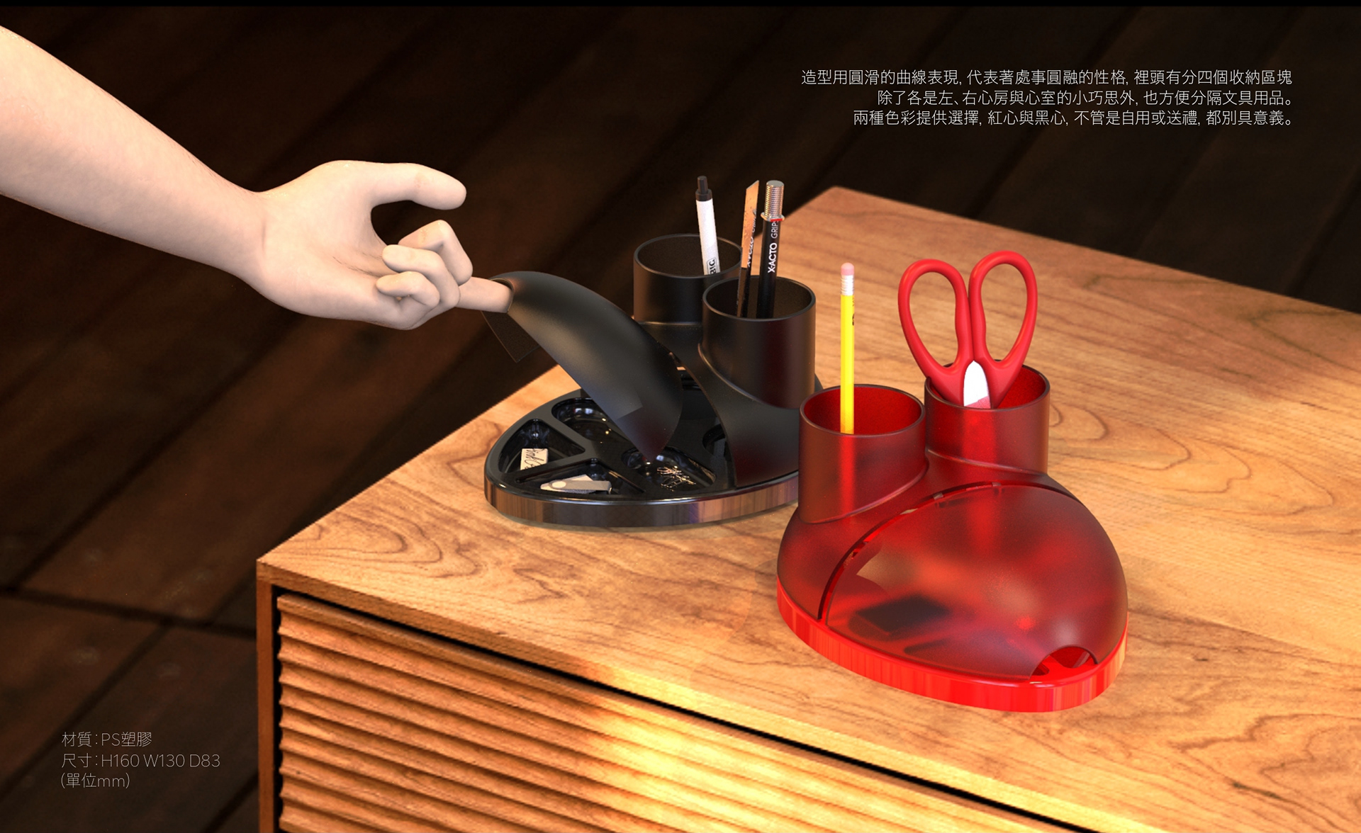 造型用圓滑的曲線表現,代表著處事圓融的性格,裡頭有分四個收納區塊,除了各是左、右心房與心室的小巧思外,也方便分隔文具用品。兩種色彩提供選擇,紅心與黑心,不管是自用或送禮,都別具意義。